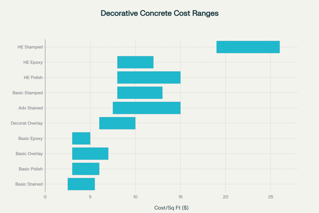 Decorative concrete overlays provide versatility at moderate costs. Basic overlays range from $3 to $7 per square foot, while decorative overlays with enhanced features cost $6 to $10 per square foot. Complex multi-color designs can reach up to $25 per square foot.