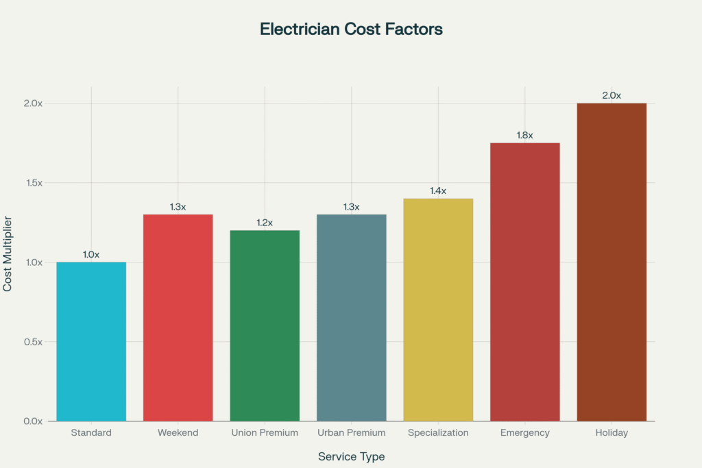 Emergency electrical services command significant premiums due to the urgent nature and disruption to normal schedules. Emergency rates typically range from $150 to $200 per hour, representing a 75% to 100% premium over standard rates. After-hours, weekend, and holiday services can cost double standard rates or more.